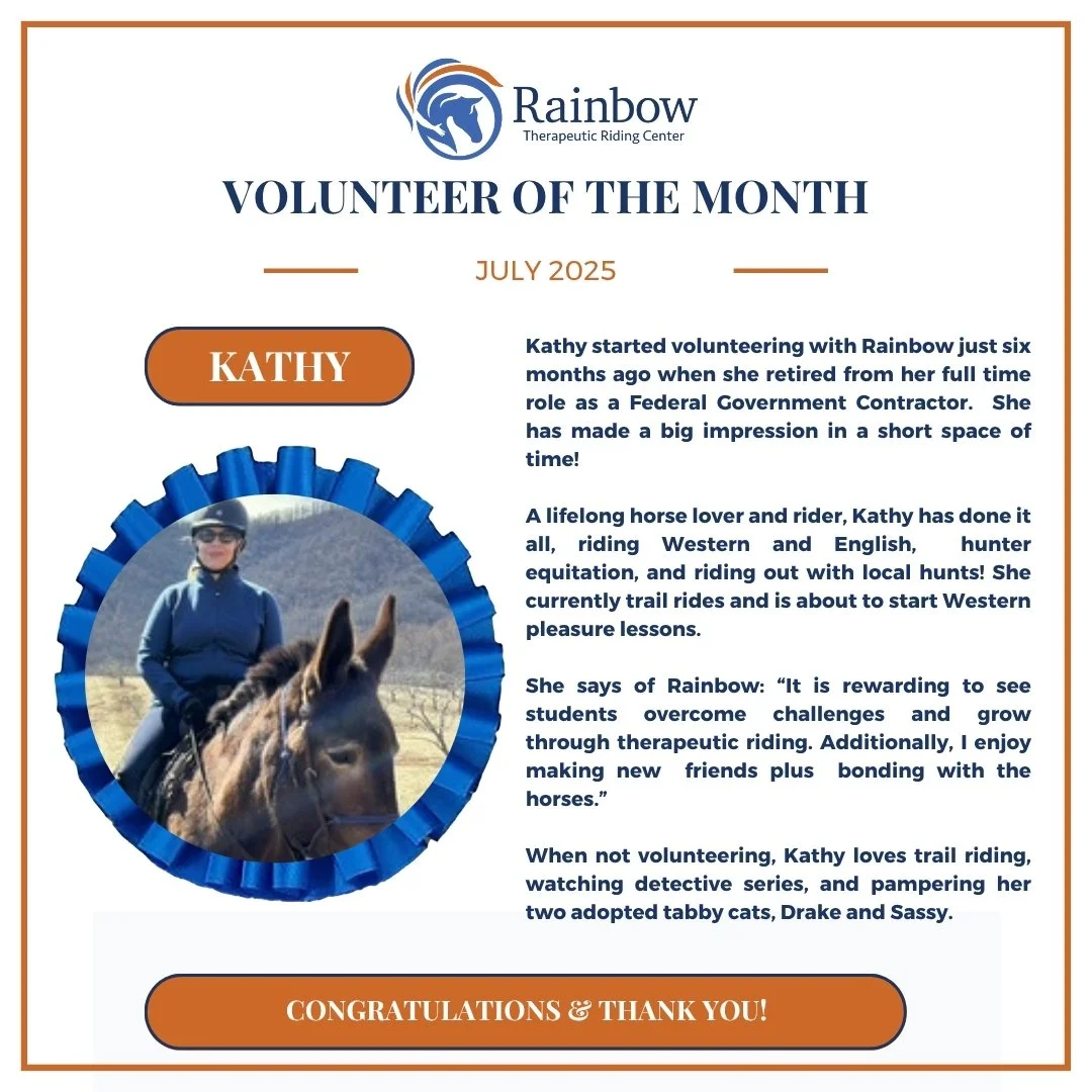 Congratulations to our July Volunteer of the Month, Kathy! Thank you for all you do for Rainbow!