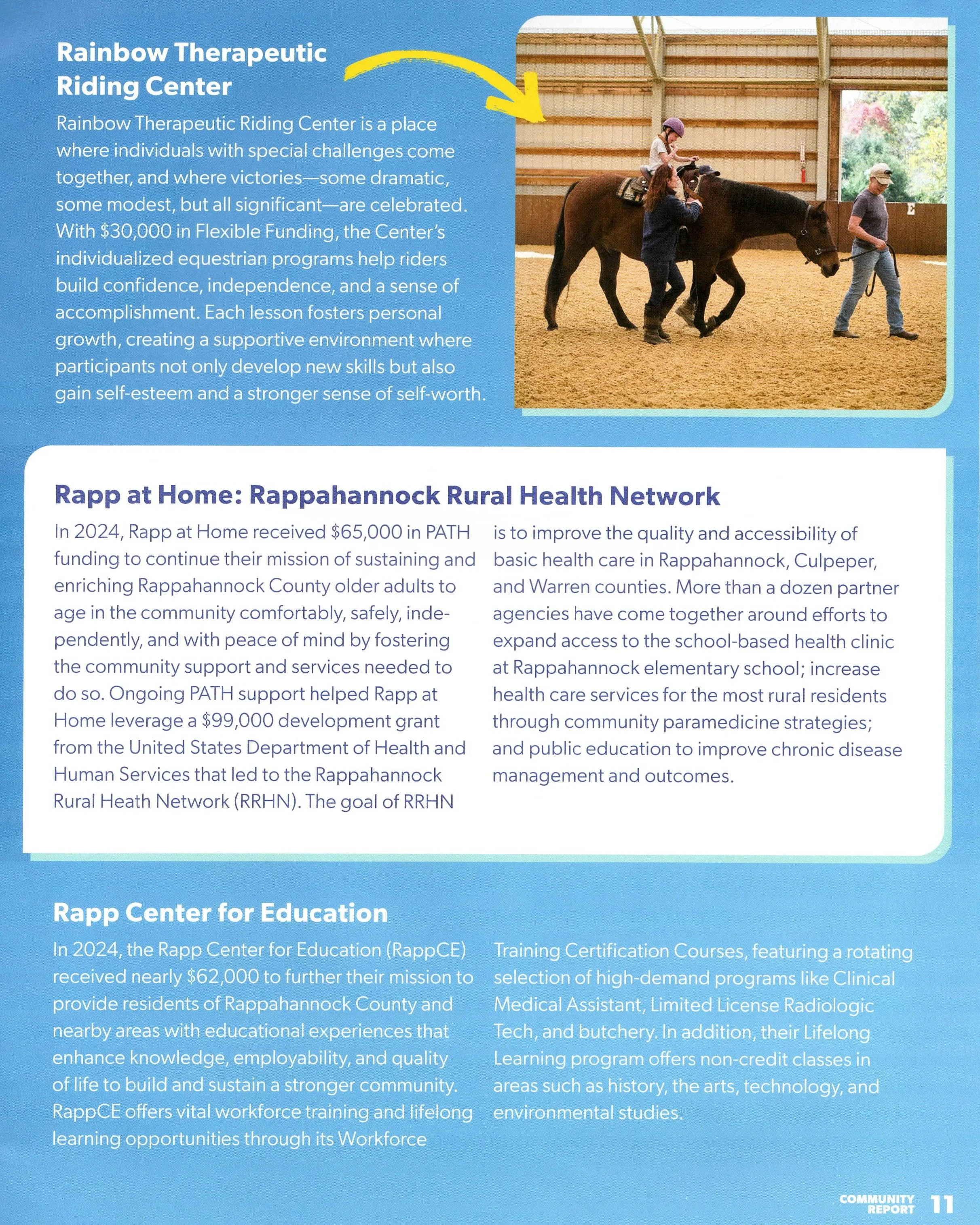 We were THRILLED to find Rainbow Riding Instructor Amanda on the cover of their 2024 Community Report, and a great write up on the support they have given us to enable us to continue our equine assisted therapy.